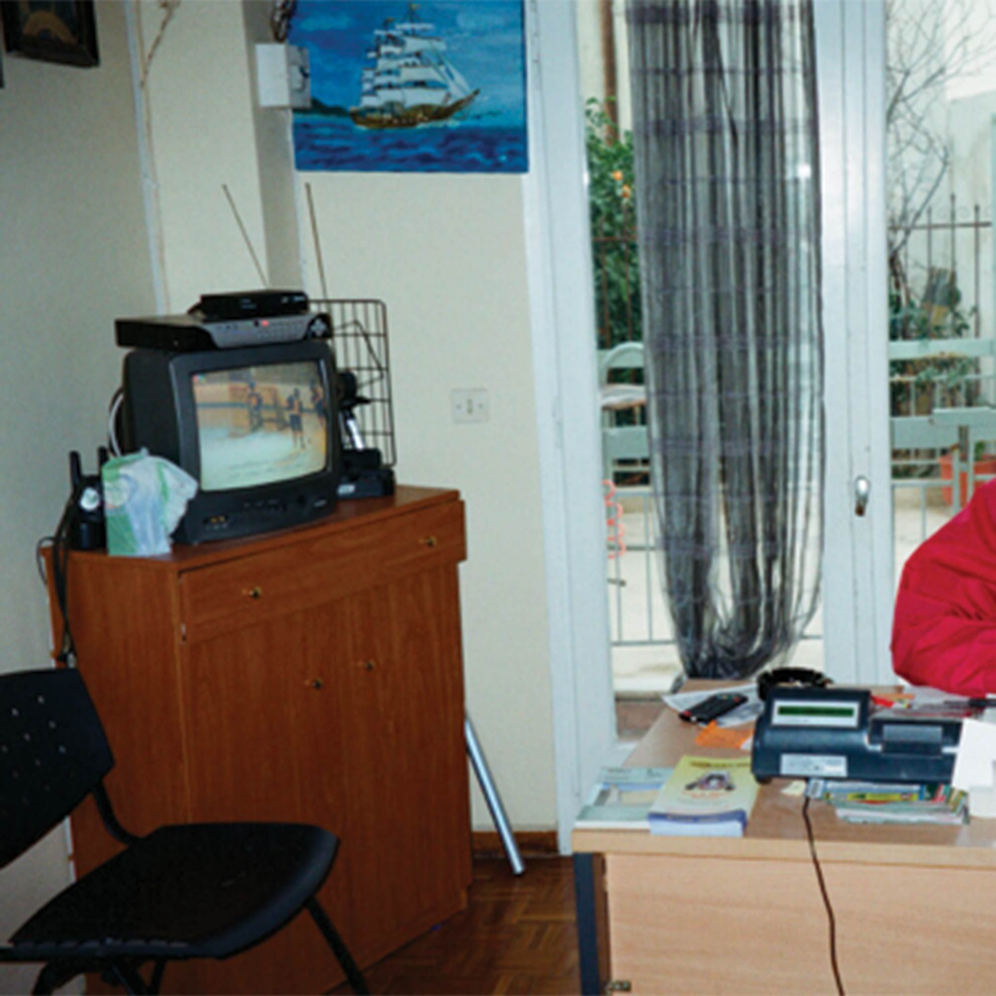 Lets talk about the tapestry of this 80’s style office, about the olive wood framed iconography designed to soothe and remind that in the 80’s lots of people died too, about the 80’s in all the concomitant gadgets. Where was this trauma in the 80’s. Or is it leftover? Where do the feelings go? Where are all the feelings from the 80’s now? What about the 149 bodies full of feelings left to the sea this morning? Office space architecture, 2 desks populated with things, corners of religious posters, maps, ships, clocks, pictures of cars, calendar, fax machine, 80’s halogen heater, old carina till, 2-seater leather lilac round sofa with pink leather car seat backs, small faded wash purple flowery armchair, tool room, small television.
