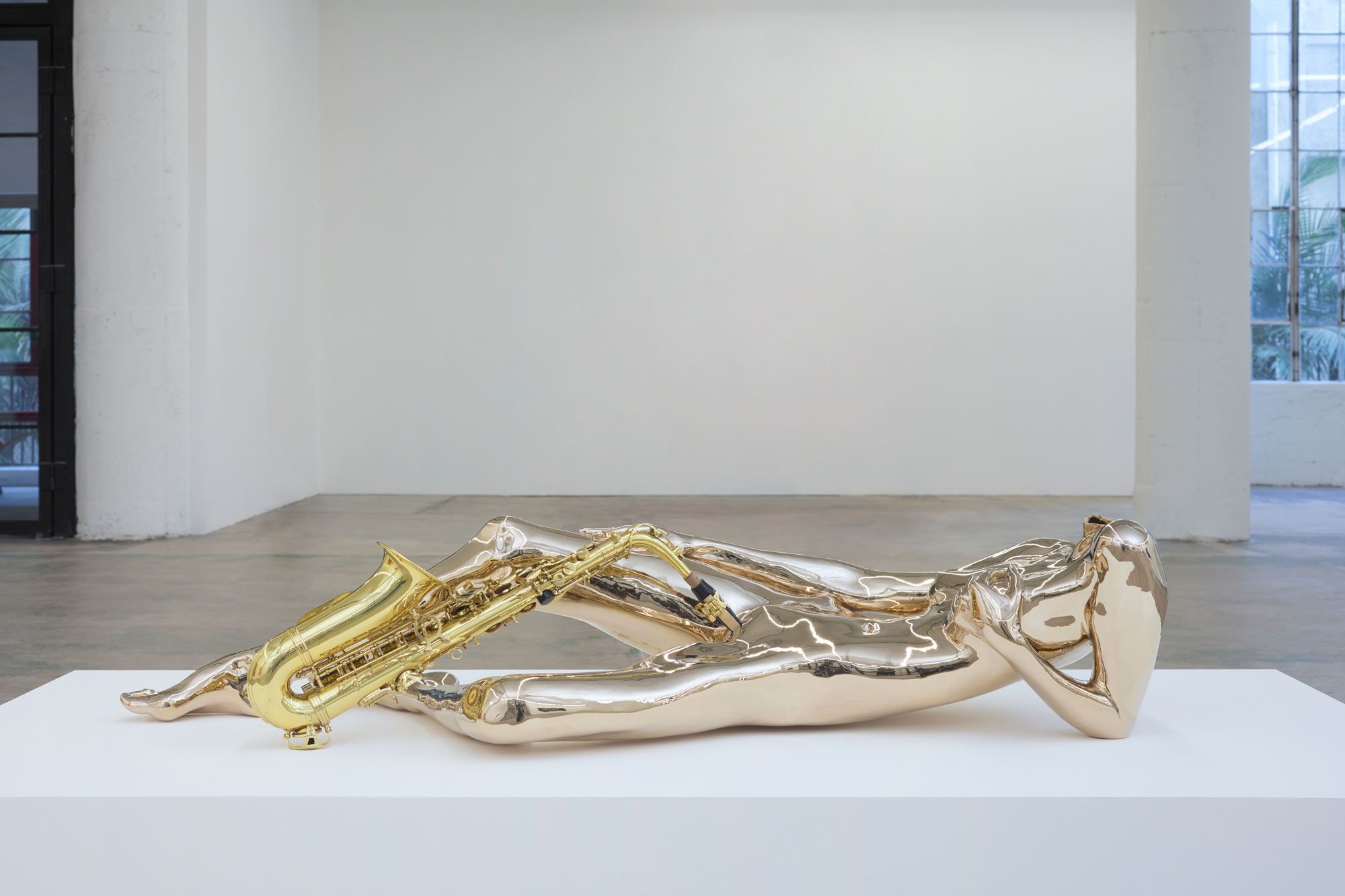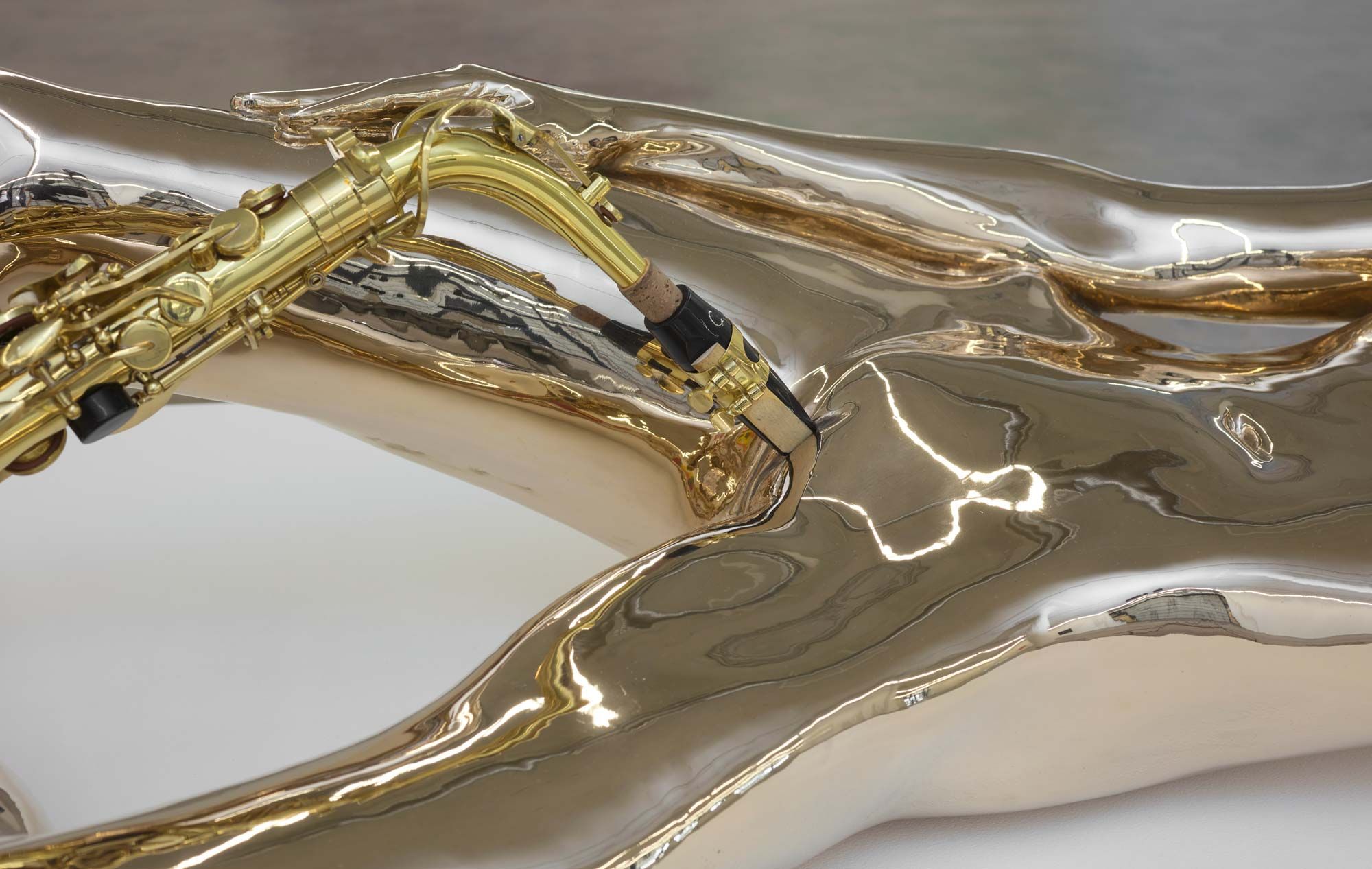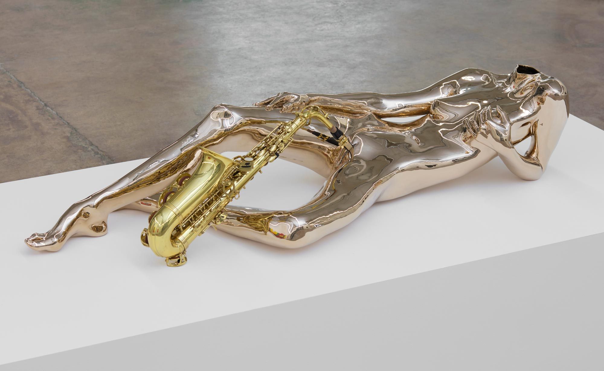 It made sense to me that a rape would be so central to western art’s birth story. And so I decided to fuck with this story to begin my Orgy. The first sculpture in Orgy For 10 People In One Body is a transmutation of the Leda and the Swan myth. In this sculpture, I perform Leda in a cast bronze of my body, while Zeus is represented by a saxophone that I play with my pussy. The beak of the saxophone as swan is connected to my body at the lips of my vagina, and in this rendition all the power in the brass saxophone is being usurped by the bronze body. The saxophone swan is being played by the female figure, and from some angles the swan itself becomes a phallus, another extension of the power and freedom embedded in the body.