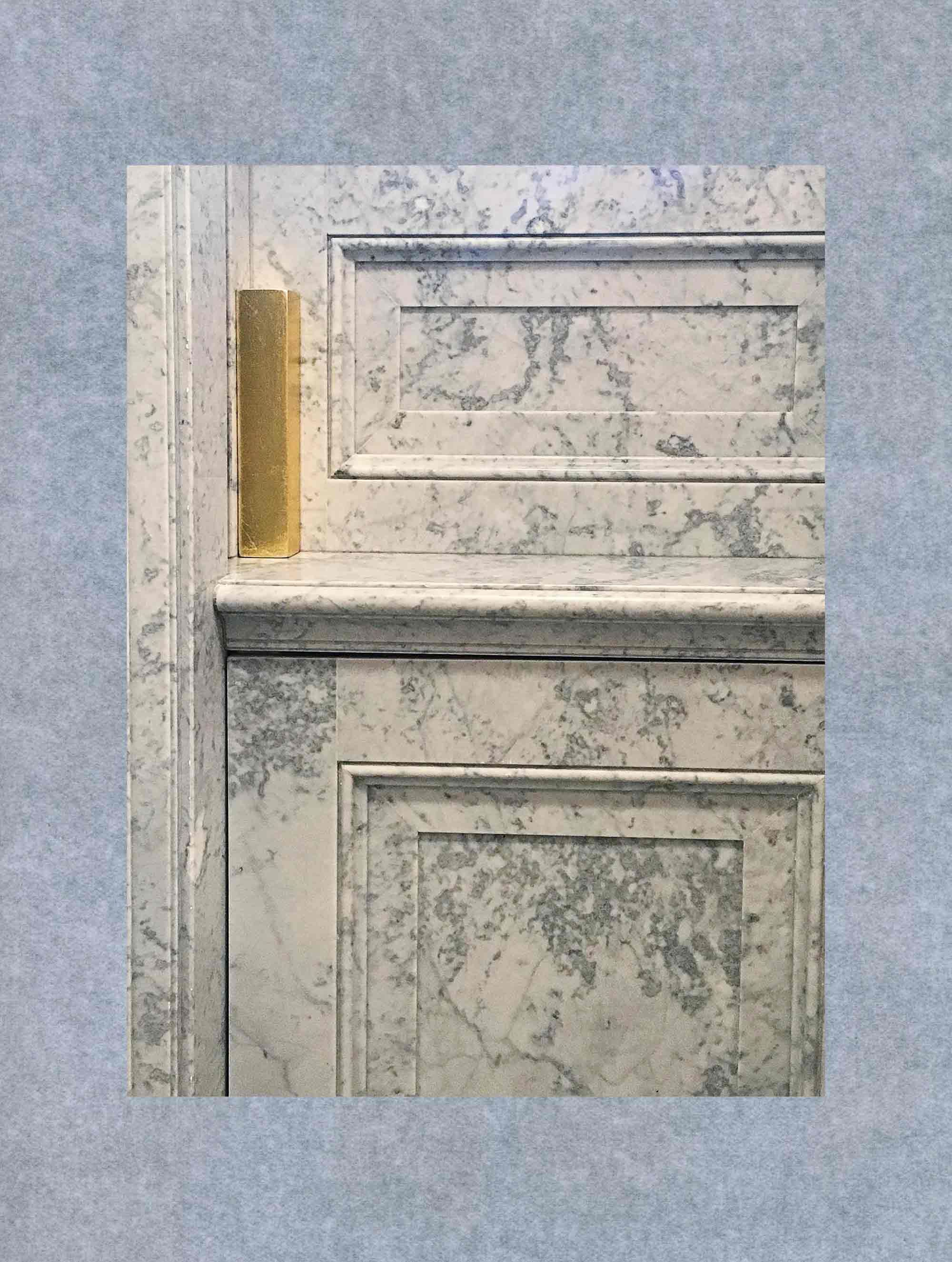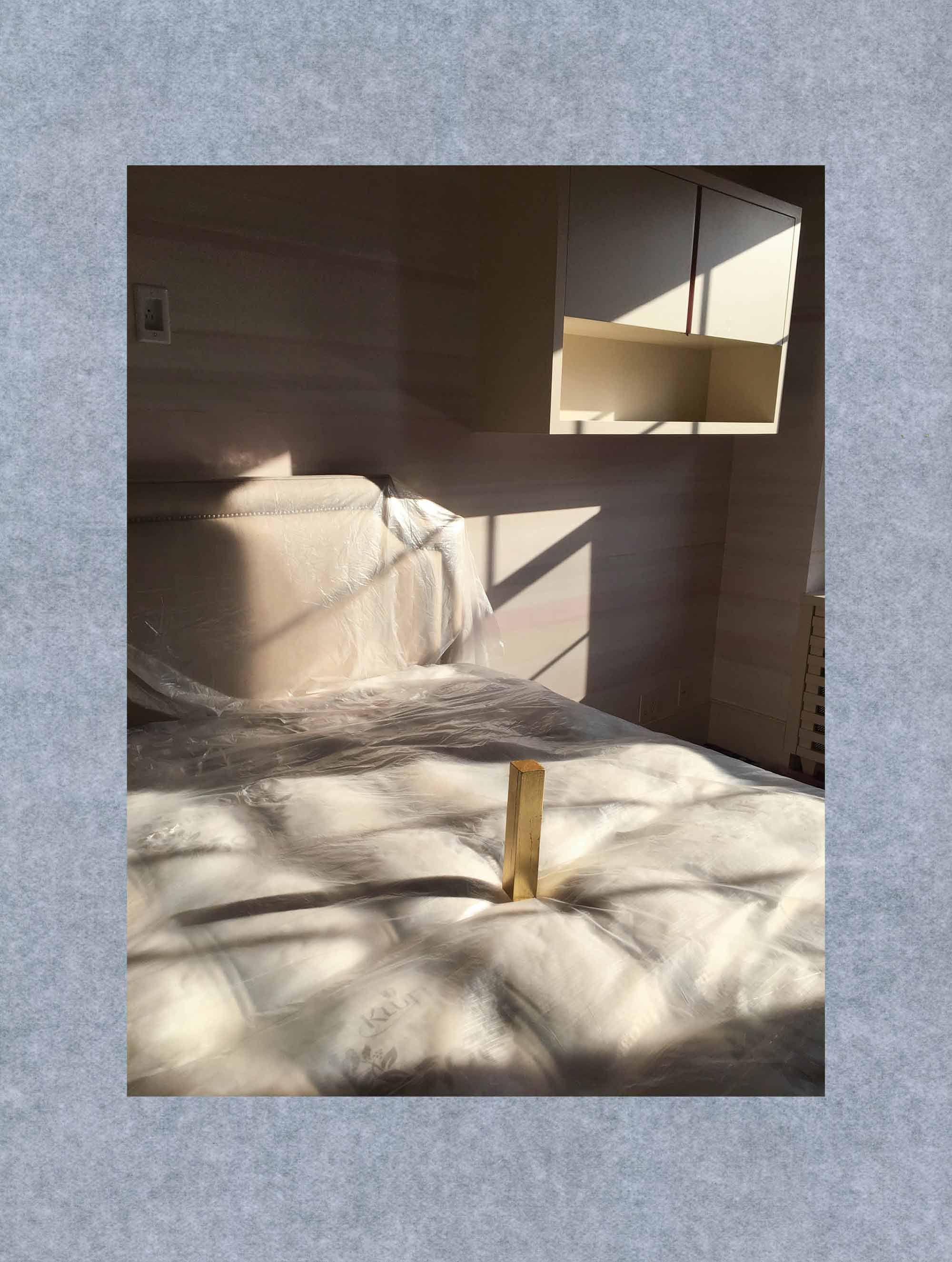 Here, a gold bar inserts itself, demanding attention. The bar is a wild card, a stand-in that animates objects and scenes belonging to the interior. Under pressure its meaning shifts, its course aerating a hermetically sealed environment. Pass through, and a terrain unfolds where something in excess of what is allowed can appear, detach and roam.
