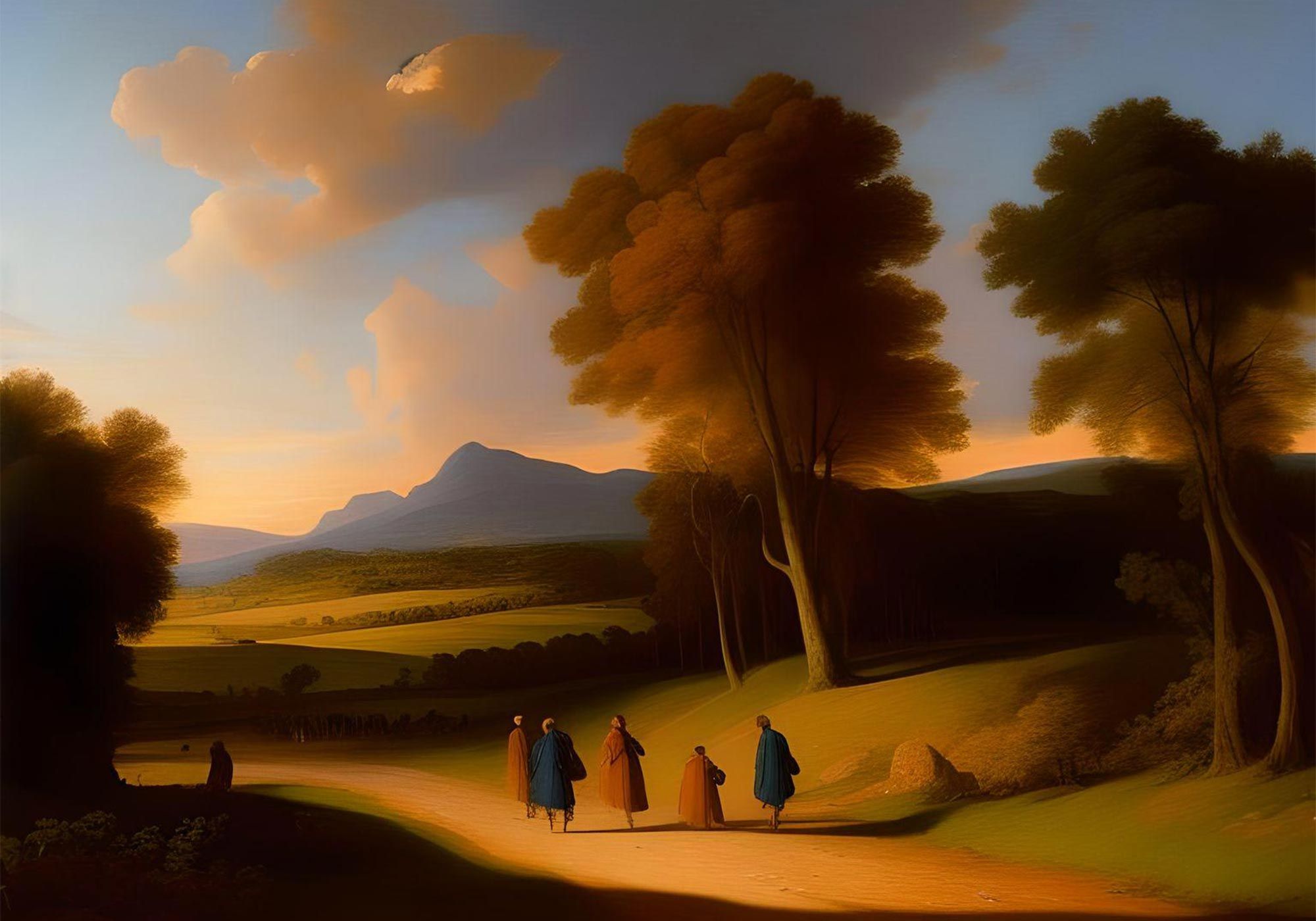 Poussin’s figures look like tourists to the antique hills. Their primary-coloured togas fall about them a bit too neatly to be convincing as weary travellers, striding, at first glance, with the composed carefreeness of Anthropologie models. That the world of the history paintings that made his reputation is a secondhand impression taken from the classical sources of his education and his experience in Rome is no surprise; the sense of anachronism here is barely noticeable compared with the crenellated castle walls of Landscape with a Calm (1650-51) or the distant round city towers of Landscape with a Man Killed by a Snake, much less the fashion choices of his early Baroque predecessors. As Alexander Nagel and Christopher Wood note, anachronism was a feature of early modern art that pointed to a “substitutional” model of aesthetic time, one that occurs parallel to the stylistic chronological markers of art history. The Renaissance partly “proposed the perfect interchangeability of one image or work for another”, so that the Roman friezes and sarcophagi from which Poussin took bacchantes and mourners were somehow present in the frigid space of the easel painting: “the prior is no longer prior but present”. The explicit classicising of A Roman Road (1648), the diptych’s more elaborate counterpart, is the 1640s’ version of a Renaissance schema for rendering the landscape of 15 centuries beforehand.