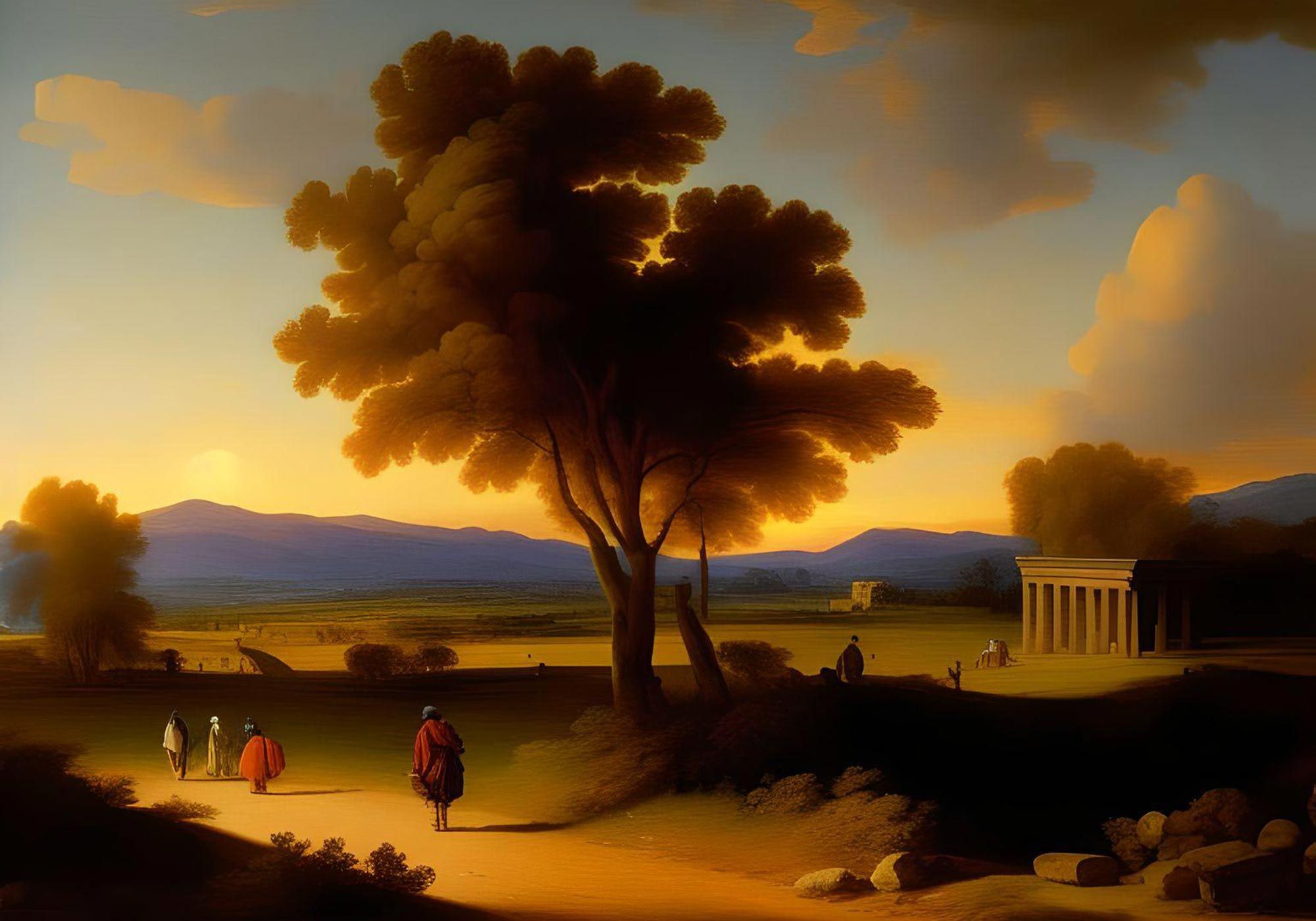 The colours are muted, a careful and narrow band of browns shading through to the off-white of limestone. Man Scooping Water feels close to sunset with the lengthy shadows covering the path in the foreground, while Travellers Resting is overcast, weak sun illuminating the background section of path where a walker in a red toga is about to pass behind a rock. But it’s hard to tell what time of day it is: a long and gloomy Mediterranean afternoon, the gloaming when the horizon begins to clear, a mid-morning interval before the sun shines again. (The foreground darkness of Man Scooping Water even suggests an early autumn morning, but doesn’t push for it.) But the key note is one of belatedness, a dying away or attenuation of vividness, even as the paintings studiously refuse to give any clues as to what they come after. Compare with a mature history painting, even one which evades any specific framework from classical literature, such as Landscape with a Man Killed by a Snake (1648), usually hung nearby at the National. An event structures the landscape, contained in the black ribbon of the near-foreground: a man dead in a snake’s coils, another flinching from it as he runs by. The gradation of shades, running through to the hard white on the squat towers in the far distance, the hurry of the washerwoman and the fishermen in the bottom third, mark it out as a rural morning. But in the two small landscapes, nothing has ever happened or will. Travellers sit with their feet splayed out. The clouds seem as immovable as stone.