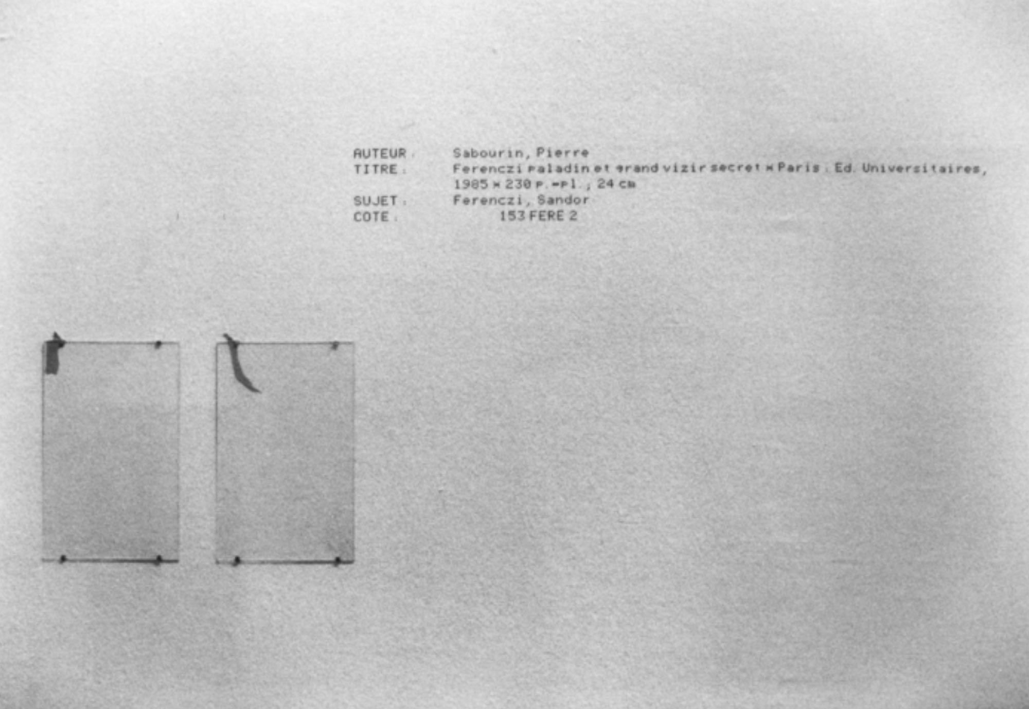 In 1991 Michael Asher put together an exhibition for the Centre Pompidou. In preparation, he scoured through every book in the psychoanalysis section of the Public Reference Library (Bibliothèque publique d’information [BPI]) housed within the Centre Pompidou, removing every bookmark, post-it note and loose scrap of paper he found, carefully documenting and cataloguing each fragment. Asher recorded the position of each fragment within the book in which it was found, and noted the book’s position on the library shelves. He then displayed these found fragments on the walls of the Galeries contemporaines behind panels of glass, cut to correspond to the dimensions of the book in which the scrap was originally discovered, the position of the scrap behind the glass corresponding to its position in the book at the moment of discovery. Wall text identified each book’s author, title, and subject, along with the code for the section of the book in which the scrap was found, and the display itself was arranged in accordance with the book’s call number and shelf position.