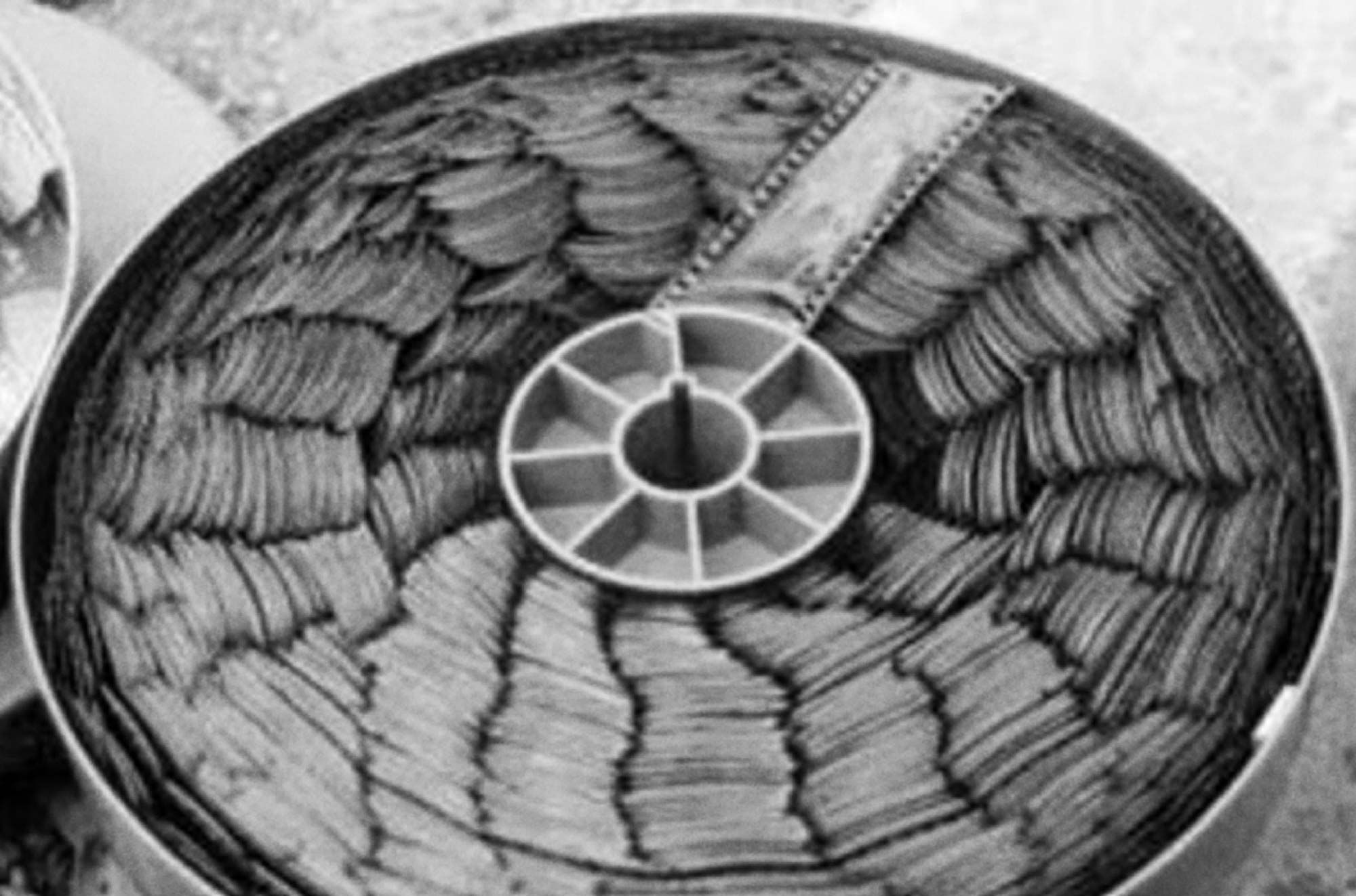 In collecting together the ephemera of the past, the archive may seem to concretize the timeline, to render it heavy, real and immovable. But as an assembly of mere things, archival memory is always already primed to speak otherwise, to make a different sense, or to cease making sense at all. On a shelf in the archive the reel of film coils tightly around itself, a dense spiral, canned for preservation and stacked among others like it. As the reel ages, the cellulose chain forming the film base comes undone, combining with water to form acetic acid. The smell of vinegar pervades the air. Film base and emulsion retract from one another. Plasticizers separate out and leach from the film's surface, forming crystaline deposits and liquid filled bubbles. Seeld in, the time-image turns on itself, set in motion by its own rotting material substrate.