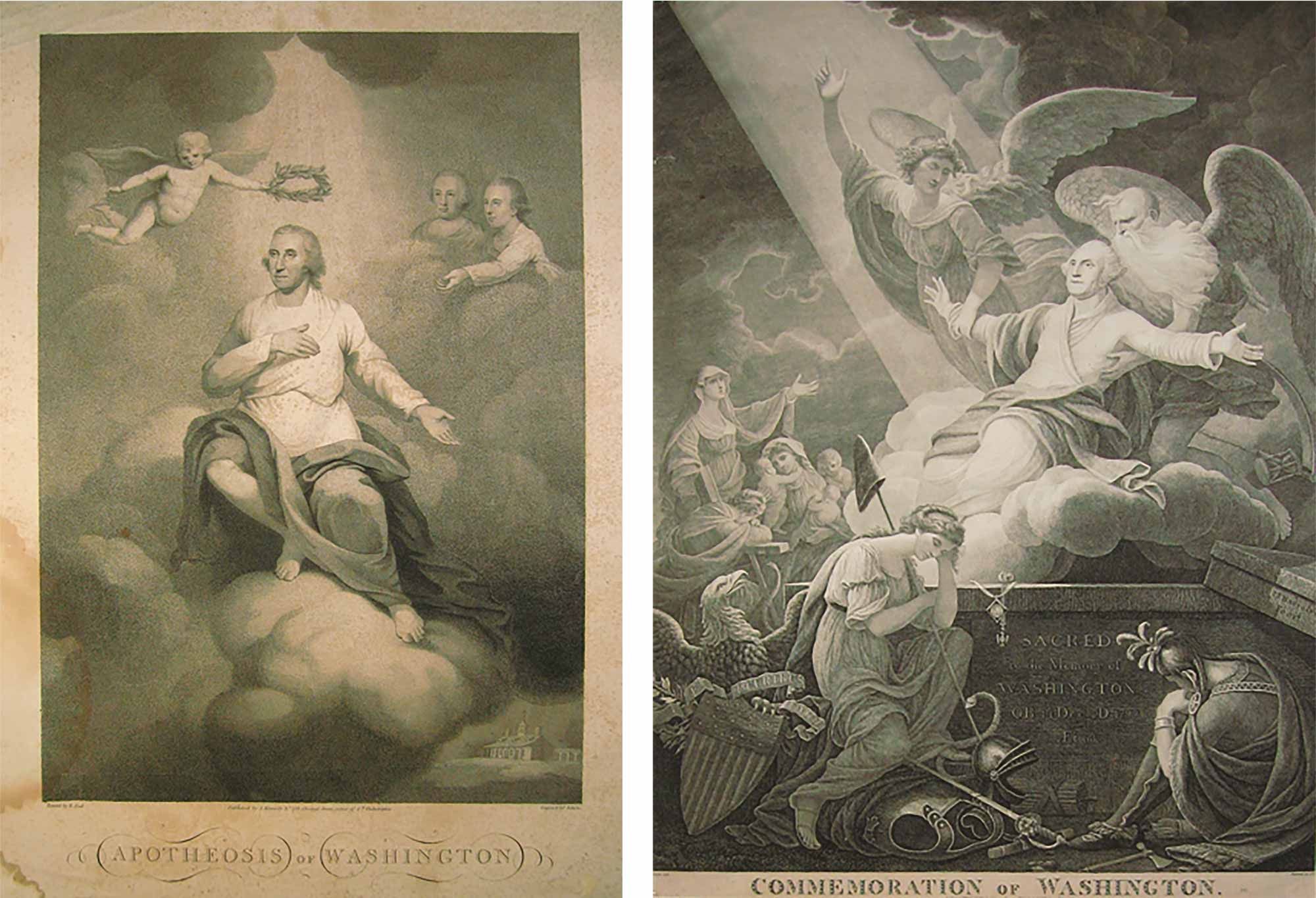 Then again, if you tilt your head at the art-historical evidence, a different pattern begins to emerge. Two generations before Brumidi devised his plan for the rotunda, there was already a market for cheap hagiography of Washington. After his abdication of the office in 1796 and his death in 1799, Gilbert Stuart’s portrait—memorialized on the one-dollar bill—was used as a template for several popular prints. The simplest image was made by David Edwin in 1800 (next page, left). Washington rests on billowing clouds, an oddly muscular cherub poised to crown him. The president’s right hand graces his chest, his left hand opens skyward behind. Washington wears classical robes, meant to look Roman; he’s young, and his face has been elongated to connote valor and dignity. He appears to sit, but to sit unnaturally; if you look closely, his posture may be less relaxed than it is braced.