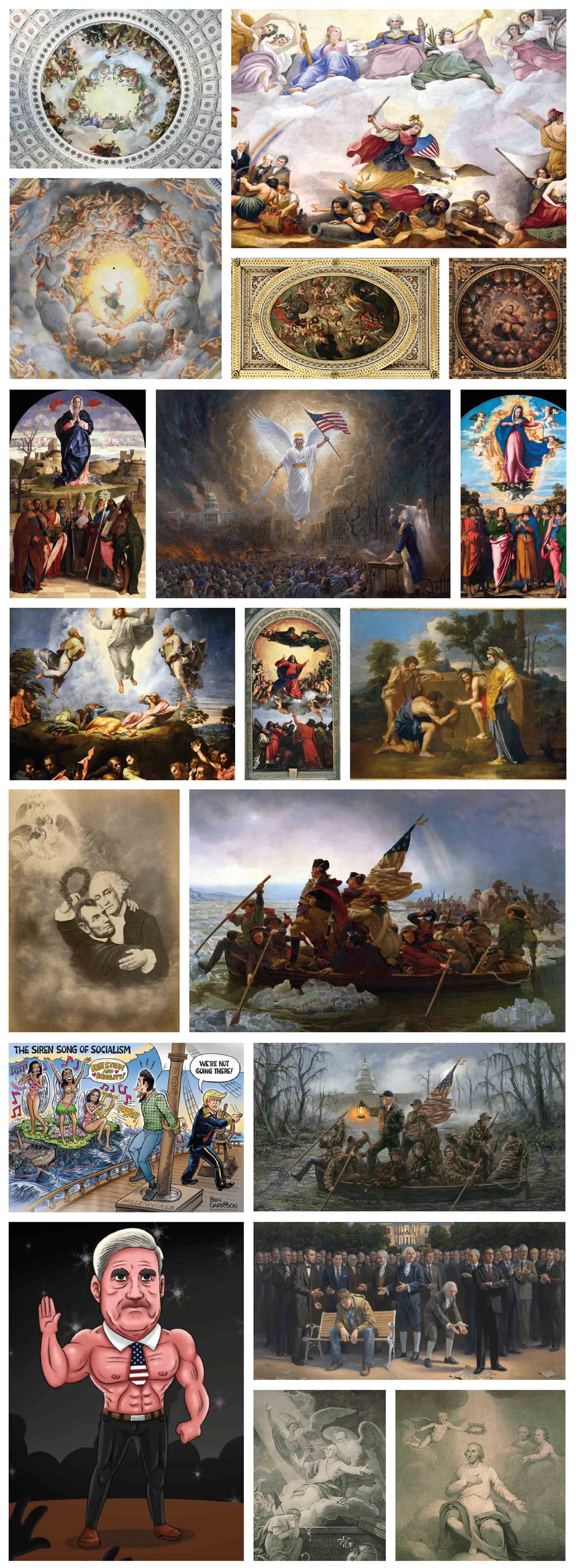 The difference between McNaughton’s depiction of Trump and Leutze’s of Washington doesn’t come down to ability alone. Crossing the Swamp is an exemplary representation of the conservative mind at work. No Apotheosis could come from the right wing these days, and especially not from popular conservatives like McNaughton. In the past few years, faith in the goodness (indeed the virility) of federal institutions has been the sole prerogative of liberals. Although conservatives hold power, it is liberals who trust the organs of government; although conservatives have shaped the past forty years of American history, it is liberals who insist that its arc bends toward justice. In order to find something as triumphant as Brumidi’s fresco, you’d have to look at figures like Ed and Brian Krassenstein, darlings of the #resistance, who recently published a children’s book with a shirtless Robert Mueller as its protagonist. (Mueller was the special counsel for the investigation of Russian interference of the 2016 election. He’s also a registered Republican, having served as director of the FBI under George W. Bush, in which capacity he testified before congress on the eve of the Iraq War that his “particular concern is that Saddam Hussein may supply terrorists with biological, chemical or radiological material.”)