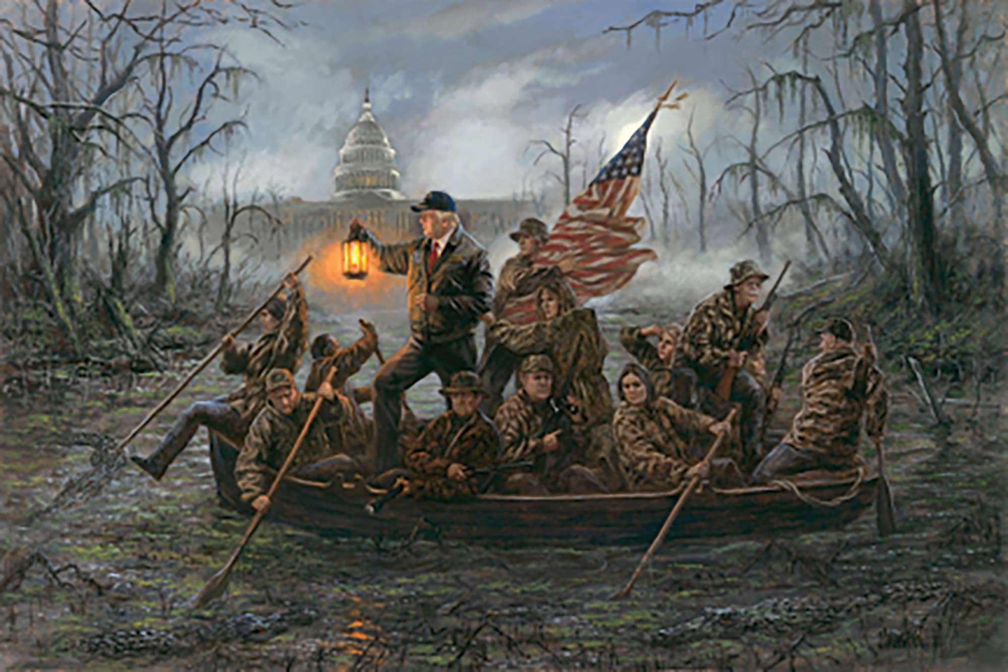 Even at his most hagiographic, McNaughton doesn’t project such confidence in his subjects. Crossing the Swamp lacks the verisimilitude that a good historical painter like Leutze would have required. Leaving aside the fact that McNaughton has introduced a swamp along the mall in Washington, D.C., the painting suffers from a notable lack of depth. Whereas Leutze centers Washington by a fleet of rowboats that extend behind him and toward the horizon, McNaughton’s composition is flat, and Trump has none of Washington’s vigor or resolve. Although the president is conspicuously fit, having traded his oversized suit for a bomber jacket and baseball cap—the same faux-military paraphranelia he wears to speak with troops in combat zones—Trump is far from heroic. He is too rigid to pull off a passable imitation of Washington’s posture: with one hand he holds a lantern that illuminates nothing, while the other floats aimlessly nearby, as if ready to grasp what the first hand might be expected to drop. Trump’s insecurity registers in the expressions of the crew as well. Rather than Leutze’s determined and ambitious oarsmen, McNaughton gives us select members of Trump’s administration and family, dressed in camouflage and armed with shotguns, like the yokels they are. They don’t look forward, toward some destination, but at the alligators that have circled the boat from all sides. In the painting’s curiously dimensionless space, threats to the crew are everywhere. There is no particular shore the boat needs to reach because there is no particular space where Trump will be safe from danger. McNaughton’s painting is not a scene of heroism but a scene of horror.